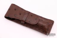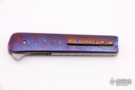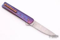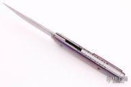 This knife by Gary Headrick features a Damascus blade with notched flipper. The handle has timascus scales, gold plated screws, bead blasted and fileworked titanium liners, fileworked aluminum backspacer, tip up timascus clip. Comes with a leather pouch and makers card dated April 29, 2019. Excellent condition. Nice detent, lockup and blade seating. One Off