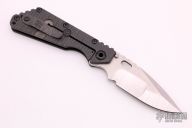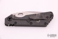 This Mick Strider SMF Fatty framelock folder features a two-tone nightmare ground blade with thumbhole and notched thumbrest. The handle has a black aluminum and flamed titanium frame with titanium clip, tip up carry. Jimping on blade spine. Nice lockup, detent, and blade seating. New condition. Comes with a velcro case.