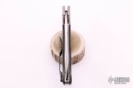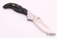 "Custom knifemakers are more than simply steel junkies. Ed Schempp is a wheat farmer, metallurgist and celebrated knifemaker whose Persian Folder introduces Classic Western with Exotic East. Persian knives traditionally are fixed blades but Ed integrates this indigenous shape into a folding knife. Comprised of graceful curving lines, the new smaller Persian Folder 75mm is eye-catching with black Micarta handle scales capped by polished stainless bolsters. On the handle a series of finger choils position the hand for complete control over the cutting edge. Its Eastern inspired blade arches into a curving belly and ends in a graceful upswept tip. The 2-15/16" (75mm) blade is made of high-performance VG-10 steel (hollow-ground) with a prominent hump positioned above the hole as a thumb leveraging spot. The pocket clip positions the folder to carry right-handed tip-up. A small portion of steel removed from the locking lever offers additional lock safety and is called a David Boye Dent. It permits tightly gripping the handle without grasping with enough force to inadvertently disengaging the lock during use." Comes with original box. Has some light scratches, otherwise excellent condition.
