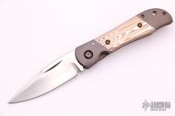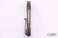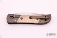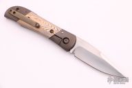 This GMC by Sal Manaro features a Super Gold 2 hand rub satin finished blade with notched thumbrest and a nail nick. The handle has an orange peel finished an anodized titanium frame with mokume inlays, custom milled anodized titanium screws and pivot, tip up orange peel finished and anodized titanium pocket clip and a checkered and anodized titanium backspacer, lanyard hole in the butt. Excellent condition.