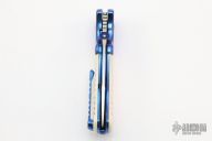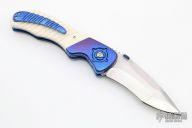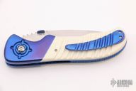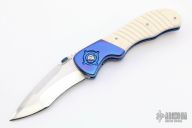 This Bullseye from Sal Manaro features a hand rub satin finished recurve blade with swedge, checkered and anodized titanium thumbdisc and notched thumbrest. The handle is comprised of dovetailed and anodized titanium bolsters, white linen micarta scales, anodized titanium liners and checkered backspacer, tip up titanium clip. Smooth action. Nice blade seating, detent, and lockup. Excellent condition.