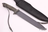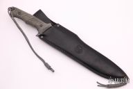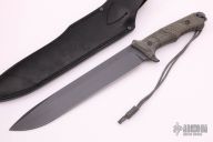 This Impofu by Chris Reeve Knives is #120 of 500. This model has been discontinued. It features a black/grey coated spear point blade with false top edge, .273" blade stock and 1.685" blade depth, full tang construction. The handle has black canvas micarta scales with extended tang and lanyard hole. Comes with a black leather sheath, original box and COA dated November 26, 2014. Excellent condition.