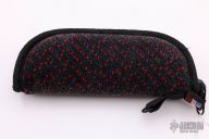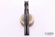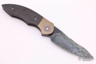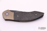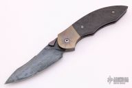 This linerlock folder by David Broadwell features a Damascus blade with single thumbstud. The handle has engraved and anodized titanium bolster, marble carbon fiber scales, textured and anodized titanium liners, carbon fiber and titanium backspacer. Nice detent, lockup and blade seating. Excellent condition. Comes with a zippered case.