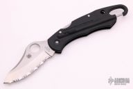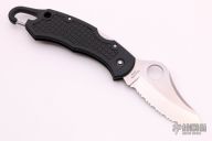 This Remote Release by Spyderco Knives has been discontinued. It has a fully serrated satin finished blade with thumbhole. The handle has a black FRN frame with a spring-loaded clip at the rear. Comes with original box. Excellent condition.
