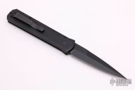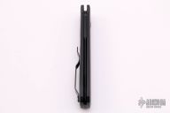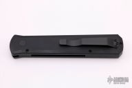 This knife features a black blade with notched thumbrest. The handle has a black aluminum frame with black hardware and black stainless steel tip up clip.  There is a lantern inlaid into the push button.  Comes with original box and papers. New from maker.