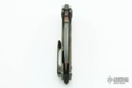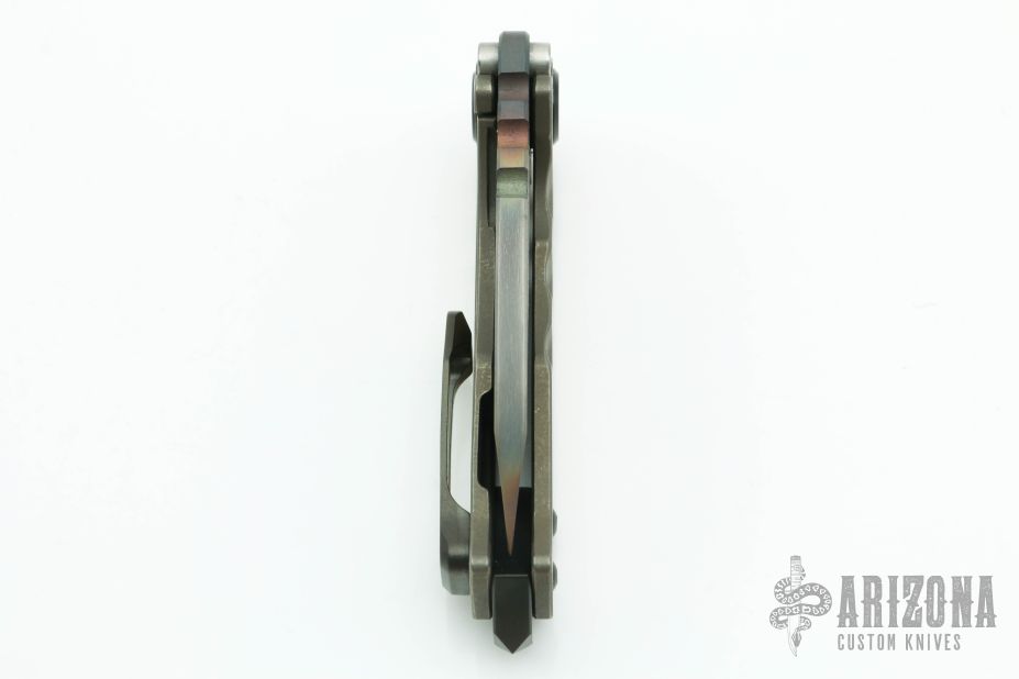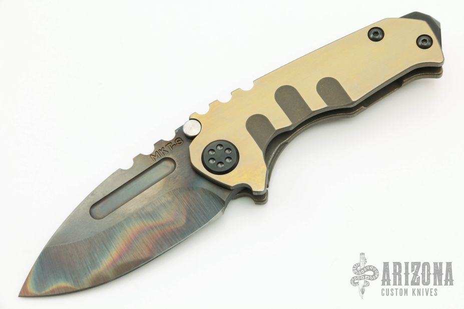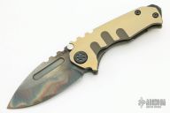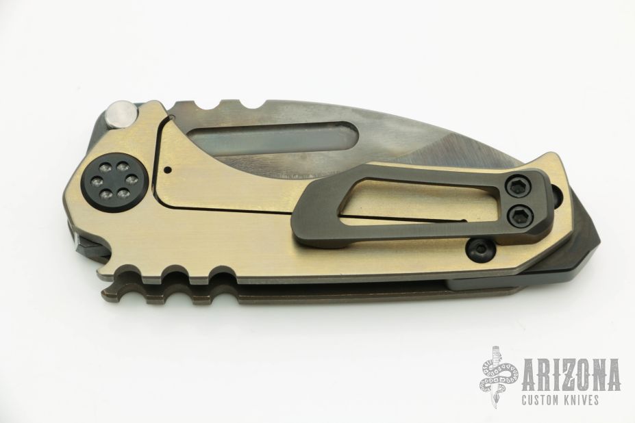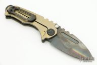 This Micro Praetorian from Medford Knife and Tool features a Vulcan finished drop point blade with notched thumbrest and ambidextrous finger groove. The frame is comprised of an anodized titanium frame with matching tip up pocket clip. Stainless steel backspacer doubles as a glass breaker. Comes with hard case and original box.  Excellent Condition.