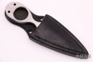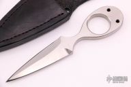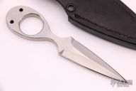 This integral dagger by Sal Manaro features a double edged hand rub satin finished blade with .266" blade stock and .853" blade depth. The butt of the handle is checkered. Comes with a black leather sheath. Excellent condition.