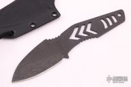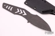 This SJ75 Neck Knife by Strider Knives has a black blade and handle, notched thumbrest, .111" blade stock and 1.479" blade depth, full tang construction. Comes with a kydex sheath. Has some scuffs, otherwise excellent condition for this vintage Strider fixed blade.