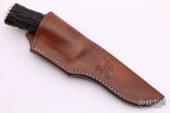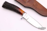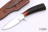 This Vanguard Hunter by Paul LeBatard features a satin finished blade with .149" blade stock and 1.056" blade depth, hidden tang construction. The handle has a stainless steel guard and butt with amber stag grip. Comes with a brown leather sheath and COA. New from maker at the 2021 ICCE show.