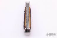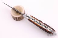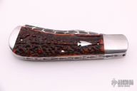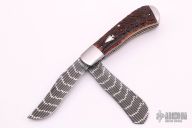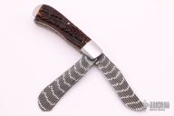 This Two-Blade Tapper by Bubba Crouch features Vegas Forge Stainless Damascus blades with nail nicks. The handle has 416 stainless steel bolsters with integral liners, red stag covers with a stainless steel arrowhead escutcheon, stainless steel liners with jeweled interiors and textured spines, vine fileworked CPM154 springs, lanyard hole. Has half-stops, flush in all positions. Comes with a zippered case. New from maker at the 2021 ICCE show.