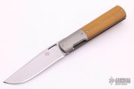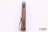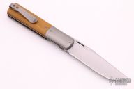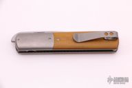 This Barlow front flipper from Brad Zinker features a tumble finished blade with checkered thumbrest and flipper. The handle has dovetailed and tumble finished titanium bolsters, butterscotch linen micarta scales, tumble finished titanium liners and tip up clip. Nice detent, lockup and blade seating, rides on bearings. Includes a padded zippered case. New from maker at the 2021 ICCE show.