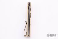 This Persian Front Flipper by Brad Zinker features a Björkmans Twist Damasteel blade with checkered thumbrest and flipper. The handle has mammoth ivory scales, anodized  titanium liners with jeweled interiors and a tip up titanium clip. Rides on bearings, nice detent, lockup and blade seating. Comes with zippered case. New from maker at the 2021 ICCE show.