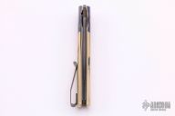 This Urban Trapper Flipper by Brad Zinker features a Vegas Forge Sharktooth Damascus blade with checkered thumbrest and flipper. The handle has dovetailed ZircuTi bolsters, mammoth ivory scales, anodized  titanium liners with jeweled interiors and a tip up titanium clip. Rides on bearings, nice detent, lockup and blade seating. Comes with zippered case. New from maker at the 2021 ICCE show.
