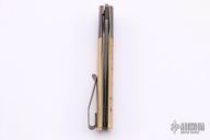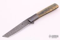 This Urban Trapper Flipper by Brad Zinker features a Vegas Forge Sharktooth Damascus tanto blade with checkered thumbrest and flipper. The handle has dovetailed ZircuTi bolsters, mammoth ivory scales, anodized  titanium liners with jeweled interiors and a tip up titanium clip. Rides on bearings, nice detent, lockup and blade seating. Comes with zippered case. New from maker at the 2021 ICCE show.