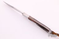 This Trapper by Phil Jacob features a hand rub satin finished blade with a single nail nick. The handle has steel bolsters, deep amber jigged bone covers with a stainless steel escutcheon, stainless steel liners and spring with Roman Knot file work that runs all the way down the spring. Has half-stop, flush in all positions. Includes a padded zippered case and COA. New from maker.