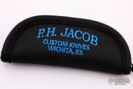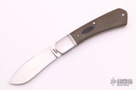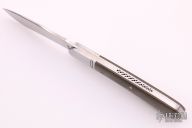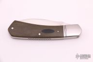 This Moose Head by Phil Jacob features a hand rub satin finished blade. The handle has steel bolsters, green micarta covers with a micarta shield, stainless steel liners and Roman Knot fileworked back spring.  Has half-stop, flush in all positions. Includes a Padded zippered case and COA. New from maker.