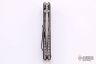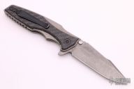 This rendition of the 0393 folding knife is outfitted with a working finished handle and blade, and impressive glow in the dark carbon fiber overlays. ZT's 0393 pairs an aggressive Rick Hinderer design with a solid Zero Tolerance build to create a substantial EDC folding knife. The 0393 sports a Hinderer Maximus inspired handle with a titanium frame and stunning glow carbon fiber overlays. When not charged the glow carbon fiber looks just like regular carbon fiber. Its harpoon style blade is made from CPM-20CV steel in a working finish. This knife is compatible with a selection of Hinderer custom hardware to make your knife stand out from the crowd. Features: KVT ball-bearing pivot for smooth and easy one-handed opening. Reversible pocket clip for secure left or right tip-up carry. 20CV Spanto blade provides excellent edge retention, superior hardness, and piercing power. Has some wear on the pocket clip, otherwise excellent condition. Comes with original box and papers.