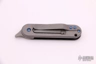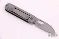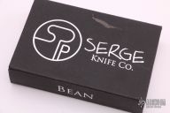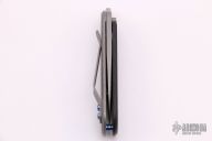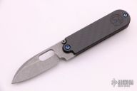 This Bean folder by Serge Panchenko features a stonewashed, m390 blade with front flipper/friction bar and thumb hole. The handle is stonewashed titanium and carbon fiber with a matching tip up clip. Has a detent to hold the blade in position open/closed, but it does not lock. Comes with original box.  Excellent condition.