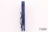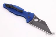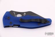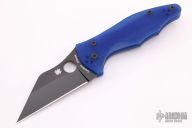 This Yojimbo 2 by Spyderco features a black finished wharncliffe blade with thumbhole. The handle has a blue G-10 frame with stainless steel liners, lock is on the spine of handle. 4-way reversible stainless steel clip. Nice detent, lockup and blade seating. Comes with original box and papers. Excellent condition.