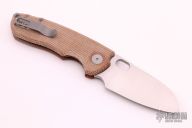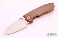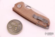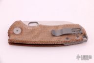 This F5.5 by Urban EDC Supply is a Vox Design. It features a satin finished blade with thumbhole and notched thumbrest. The handle has natural canvas micarta scales, blasted titanium liner, backspacer and tip up clip. Rides on bearings, nice detent, lockup and blade seating. Comes with challenge coin #935. Excellent condition.