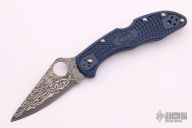 This knife by Spyderco has a Damascus VG-10 Core blade with thumbhole opener and notched thumbrest. The handle has blue FRN scales and a 4-way reversible stainless clip. Comes with original box and papers. Excellent condition.