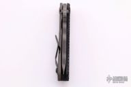 This SNG by Strider Knives features a tiger striped tanto blade with notched thumbrest and thumbhole. The handle has a Frag pattern black aluminum and flamed titanium frame with matching tip up clip. Nice detent, lockup and blade seating. New condition.