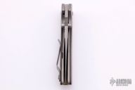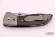This Toshi by John Barker features a tumble finished blade with notched thumbrest and dual thumbstuds. The handle has tumbled titanium bolsters, liners and tip up clip, green canvas micarta scales and backspacer. Comes with a zippered case. Nice detent, lockup and blade seating. Excellent condition.