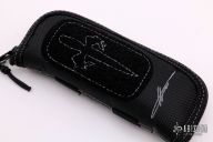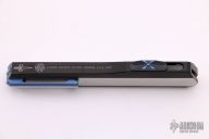 This Cypher OTF is a collaboration between Anthony Marfione and DC Monroe. It features a hand rub satin finished DLC blade with milled fullers. The handle has a two-tone DLC Roy Alloy stainless steel handle with an anodized titanium tip down clip and insert at the butt. Blue anodized titanium hardware. Comes with original box, zippered case and "IOU" for COA. Dated 03/2017 and S/N 003.