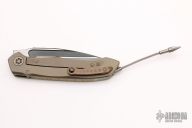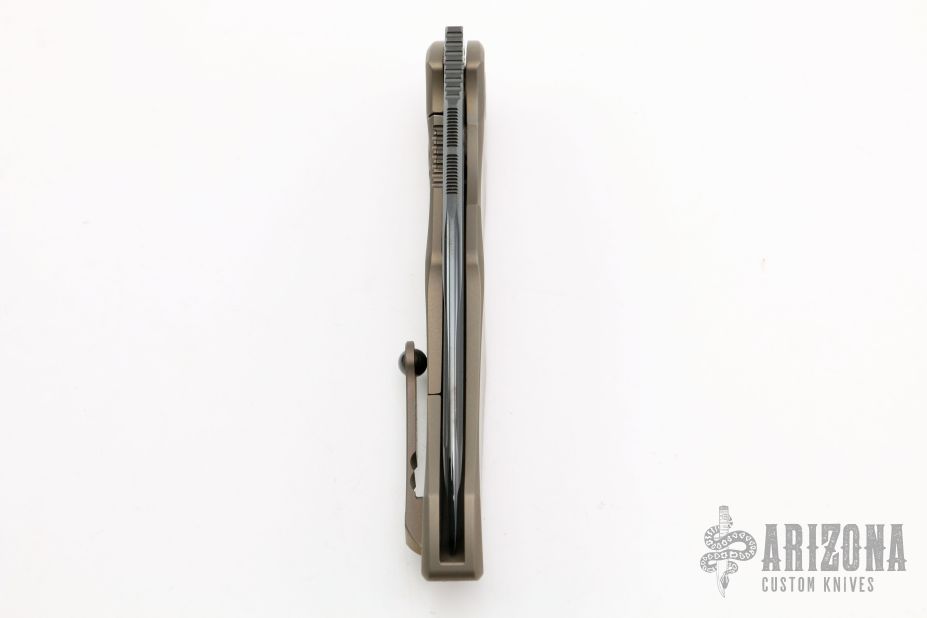 This Anax by Marfione Custom Knives features a blued W2 blade with notched thumbrest and hamon. The blade was sent to Rick Barrett for a hamon line, then the blade was blued. The hamon is very faint. The handle has an integral bronzed titanium frame. Tip up titanium clip with silicon nitride ball bearing. Nice detent, lockup and blade seating. Comes with original box, COA and zippered case. Dated 11/2014 and S/N 018. Excellent condition.