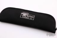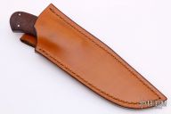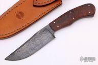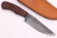 This Hunter by Erik McCright features a Stacked Ladder Pattern Damascus blade (1084/15N20) with false top edge, .139" blade stock and 1.322" blade stock, full tapered tang construction. The handle has stabilized Gidgee scales with stainless steel pins. Comes with a brown leather sheath and zippered case. New from maker at the ICCE show. Comes with COA.