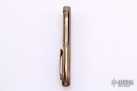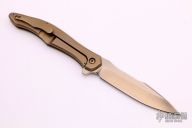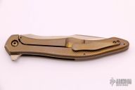 This Intake by Gerry McGinnis features a bronzed chisel ground tumble finished blade with notched thumbrest and a flipper, the blade was ground by Jeremy Horton. The handle has a milled and anodized titanium frame, tip up clip with backspacer. Nice detent, lockup and blade seating. Comes with leather zippered case. This piece is in excellent condition and shows no signs of use or carry. Originally from the ECCKS 2018