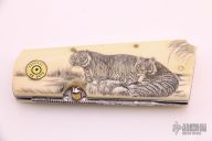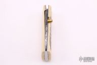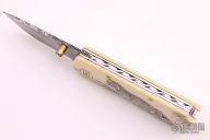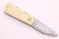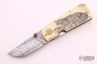 This linerlock folder by Joe Scherhaufer features a Damasteel blade with notched thumbrest and single thumbstud with sterling silver inlay. The handle has mammoth ivory scales with scrimshaw, .45 Auto pivot, stainless steel liners and fileworked backspacer. New from maker.