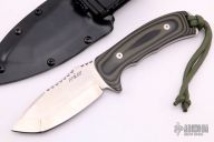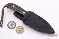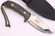 This knife features a satin finished blade with a false top edge and a fileworked thumbrest. .188" Blade Stock. 1.67" Blade Depth. The handle features G10 scales and a black kydex sheath. Includes a COA. Excellent Condition.
