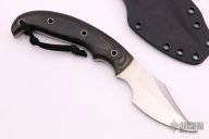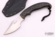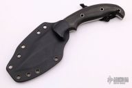 This knife by Bobby Branton features a hand rub satin finished blade with sharpened top edge, .160" blade stock and 1.457" blade depth, full tang construction. The handle has black canvas micarta scales with hollow pins. Comes with kydex sheath. Has some sheath scratches, otherwise excellent condition.