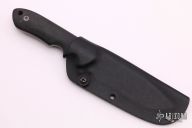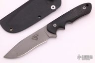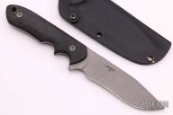 This EDC Fighter by Trace Rinaldi features a bead blast finished recurve blade with notched thumbrest, .202" blade stock and 1.243" blade depth, full tang construction. The handle has black G-10 scales with lanyard hole. Comes with a kydex sheath. Has some scuffs/scratches, otherwise good condition.