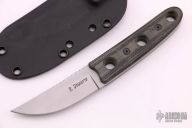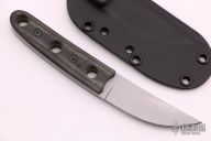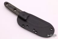 This Kwaiken by Randy Doucette features a bead blasted blade with a notched thumbrest, .135" blade stock and .928" blade depth, full tang construction. The handle has black canvas micarta scales with black screws. Comes with a kydex sheath. Excellent condition.
