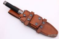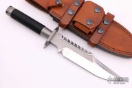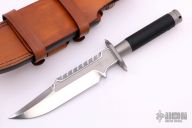 This Custom Interceptor by Marfione Custom Knives features a hand rub satin finished blade with sharpened clip point and sawteeth on blade spine, .250" blade stock and 1.687" blade depth, hidden tang construction. The handle, guard and butt are bead blast finished titanium with black Microcord wrap on the grip. Has compass inside butt cap and storage space inside handle. Comes with a Ramos Custom brown leather sheath with belt loop. Comes with a survival kit that includes waterproof pill capsule, magnesium bar, fire steel, small saw, Timberline utility knife, and a small ruler, is all wrapped in black microcord. Comes with original box and COA dated 02/2016. Excellent condition. #003