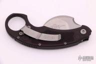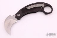 This Iconic Auto has a black handle and a stonewashed blade. Designed after the Iconic Karambit fixed blade, the Iconic Auto, made in collaboration with Bastinelli Creations, is a must-have innovative tactical knife. Most automatic knives open from a push button near the pivot, but the button on the Iconic is near the finger hole. Once you've de-activated the safety, you can open the blade with a button near the finger hole. Features: Premium stainless steel blade is tough and will hold it's edge. Unique push button action allows for a reverse grip during deployment. Finger hole allows for a secure and unbreakable grip. Comes with original box and papers. S/N 320 and dated 03/2020. Excellent condition.