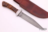 This fighter by Lee Bench Made Knives features an F.E. Edwards Damascus blade with sharpened top edge, .167" blade stock and 1.231" blade depth, full tapered tang construction. The handle has satin finished stainless steel dovetailed bolsters, curly maple scales with stainless steel pins. Comes with a brown leather sheath and nylon zippered case. Has a few light scratches, otherwise excellent condition.