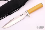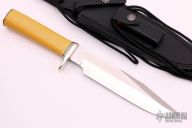 This Model 14 CDT by Randall Made Knives features a clip point satin finished blade with notched thumbrest and sharpened top edge, .231" blade stock. 1.423" blade depth. The handle has a nickel silver guard, yellow linen micarta grip with black/duralumin spacers, nickel silver butt plate. Cut Down hidden tang. This knife was designed to meet the demand for an almost indestructible all-purpose knife, though it is especially suited for combat and survival purposes. Comes with a black leather sheath. Has a couple scratches, otherwise excellent condition.