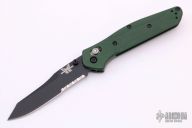 This 940SBK Osborne Axis Lock Folder from Benchmade has a black coated partially serrated blade with false top edge and dual thumbstuds. Handle is green anodized aluminum with purple anodized spacer, and black finished stainless steel tip up clip (RH/LH Reversible). Nice action, blade seating and excellent lockup. Has some scuffs, otherwise good condition.