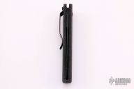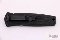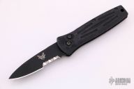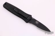 This 3550 Mel Pardue designed side opening auto from Benchmade has a black spear point partially serrated blade with a false top edge. Handle is matte black finished aluminum with milled contours, spine-thumb safety button, black stainless steel tip down clip, and lanyard hole. Scuffs on handle but otherwise good condition.