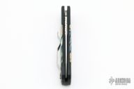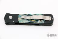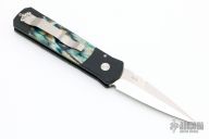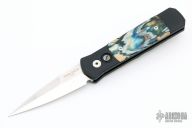 This custom Godson by Protech Knives features a satin polished finished blade with hand file work along the spine. The handle is comprised of an aluminum frame with mammoth molar inlays and push button. Tip up black stainless steel clip. Comes with original box and papers. Has a few very light scratches, otherwise excellent condition.