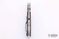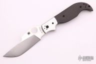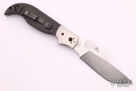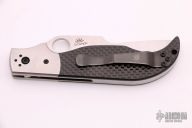 This Navaja by Spyderco was designed by Ed Schempp. It features a satin finished blade with notched thumb and index rests, thumbhole opening. The handle has satin stainless steel bolsters, carbon fiber scales, stainless liners and backspacer, and a black tip up stainless steel clip. Nice detent, lockup and blade seating. Comes with original box and papers. Excellent condition.