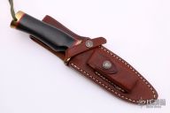 This Sergeant's Special by Randall Made Knife features a satin finished blade with sharpened top edge and a notched thumbrest, .220" blade stock and 1.370" blade depth, hidden tang construction. The handle has a brass guard and butt with a black linen micarta grip and red spacers. Comes with a brown leather sheath and original papers. Excellent condition.