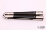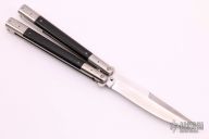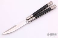 This Balisong by Pinoy Knives (Matt Cook) features a satin finished blade with false top edge. The handles are polished stainless steel with black canvas micarta inlays. Has a few light scratches, otherwise excellent condition. Comes with a zippered case.