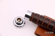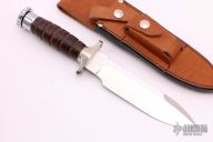 This Survival knife by Hackman features a spear point blade with sawteeth on the spine, .234" blade stock and 1.534" blade depth, hidden tang construction. The handle has a stainless guard, stacked leather hollow handle and removable stainless butt cap, has storage area in handle. Comes with original brown leather sheath with compass and sharpening stone. Has some scratches, otherwise excellent  condition.