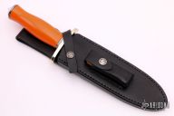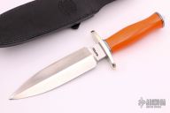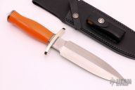 This Tom Clinton Special by Randall Made Knives has a double-edged stainless steel satin finished blade, .233" blade stock and 1.632" blade depth, hidden tang construction. The handle has a forward curved nickel silver guard, orange G-10 grip with a duralumin butt. Comes with a black leather sheath. Excellent condition.