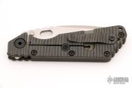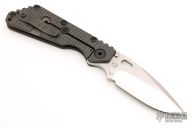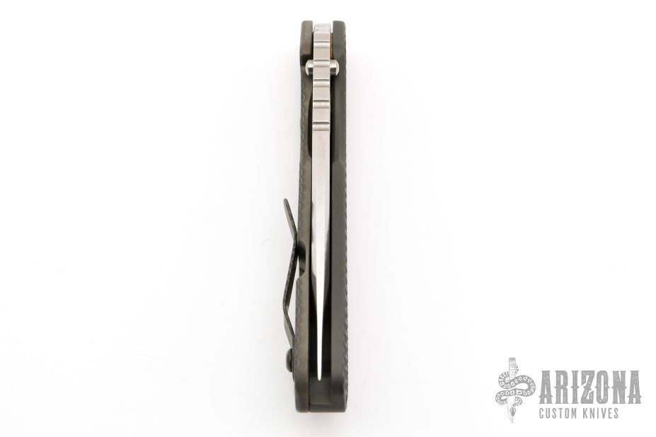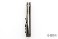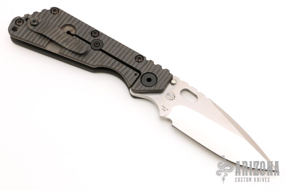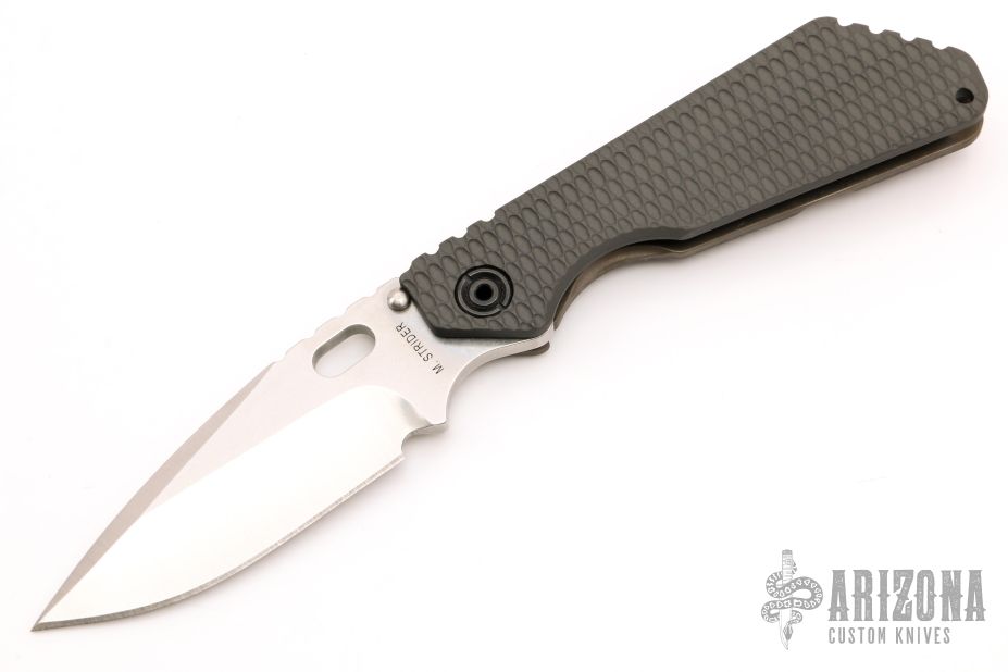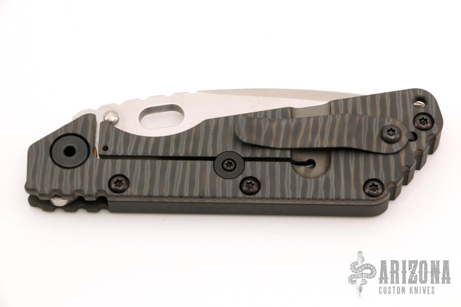 This SMF framelock folder by Mick Strider features a two-tone spear point blade and a dimple pattern grey aluminum and flamed titanium frame and tip up titanium clip. Includes a "Lock Bar Stabilizer" for maximum reverse lock retention. Nice detent, lockup and blade seating. New condition.