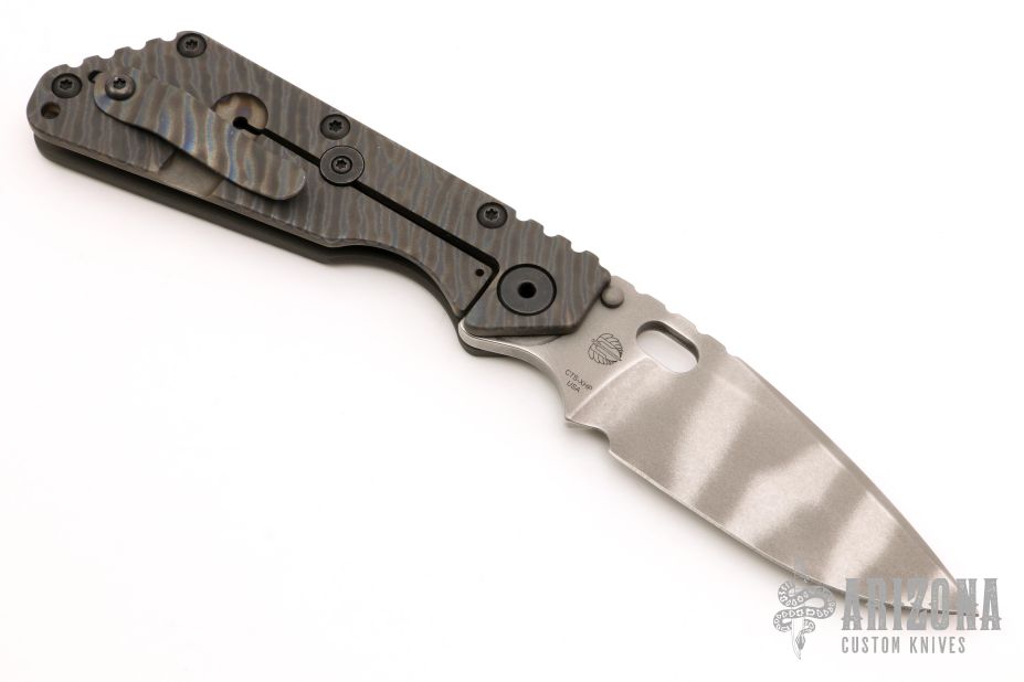 This SMF framelock folder by Mick Strider features a Ghost Stripped drop point blade and a dimple pattern grey aluminum and flamed titanium frame and tip up titanium clip. Includes a "Lock Bar Stabilizer" for maximum reverse lock retention. Nice detent, lockup and blade seating. New condition.